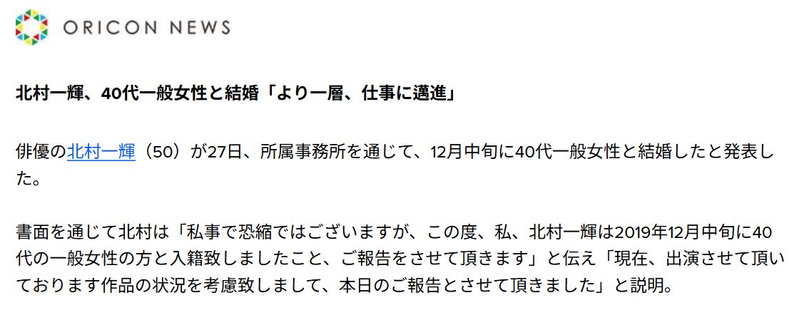 - 北村一輝 嫁は2019年12月に結婚が発表された